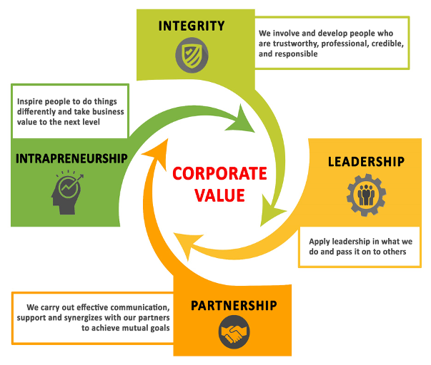 We invoilve and develop people who are trust worthy, professional, creadible and reseponsible, then applying leadership in what we do and pass it on to others in the group company. We carry out effective communication support and synergizes with our partners to achieve mutual goals and inspire people to do things differently and take business value to the next level.